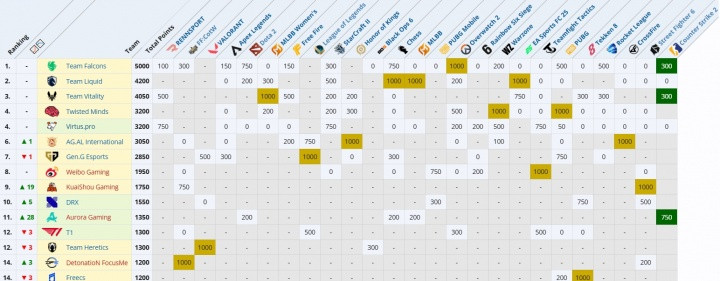 TeamFalcons以5000积分继续位列第一名,卫冕EWC俱乐部冠军,将获得700万美元奖金;