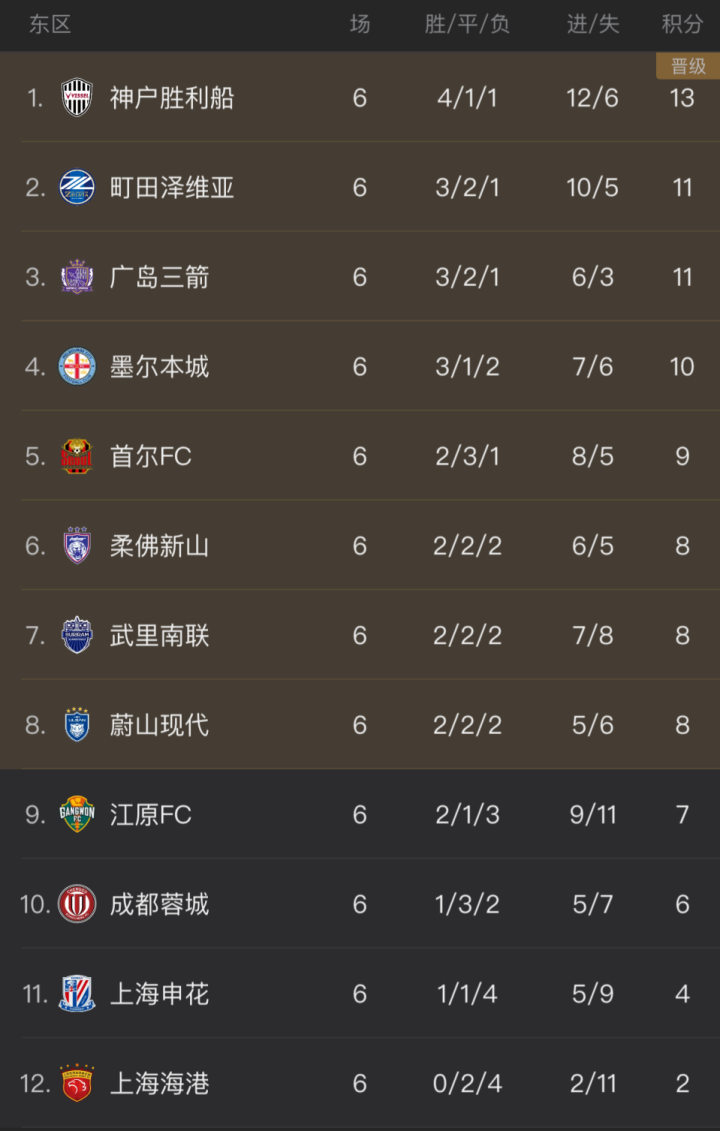 亚冠6轮战罢,中超3队依然包揽积分榜最后3位。其中亚冠新军蓉城积6分,是战绩最好的中超队。而申花和海港分别积4分和2分,排名倒数第2和倒数第1位。