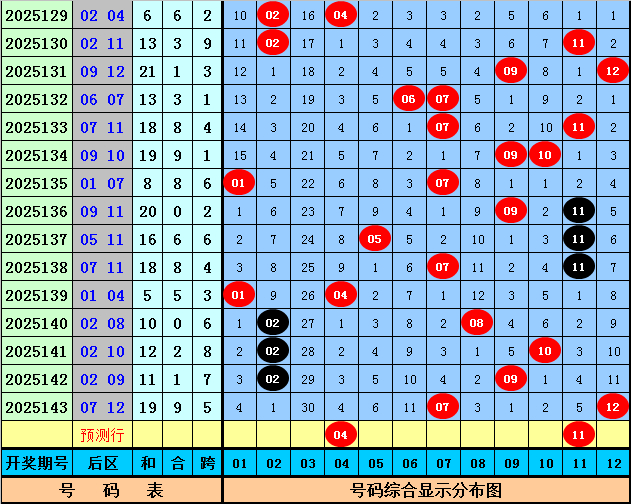 后区号码分析:上期后区开出奖号07 12,和值为19,跨度为5,本期后区参考号码04、05、06、11、12。
