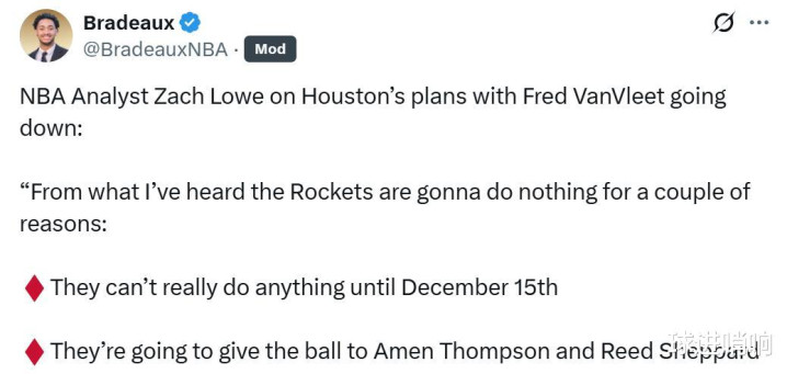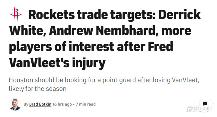 因此名记Zach Lowe也曝出,火箭队不会在范乔丹重伤后立刻进行操作,而是计划在12月15日后再有所行动,届时休赛期签下的球员将可以被纳入交易讨论。