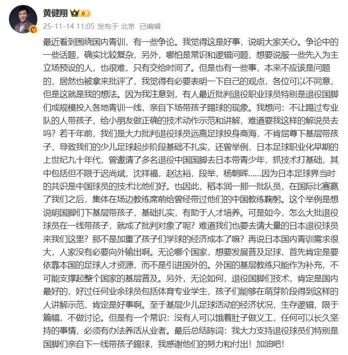 黄健翔写道:最近看到围绕国内青训,有一些争论。我觉得这是好事,说明大家关心。争论中的一些话题,确实比较复杂,另外,哪怕是常识和逻辑问题,想要说服一些先入为主立场预设的人,也很难,只有交给时间了。